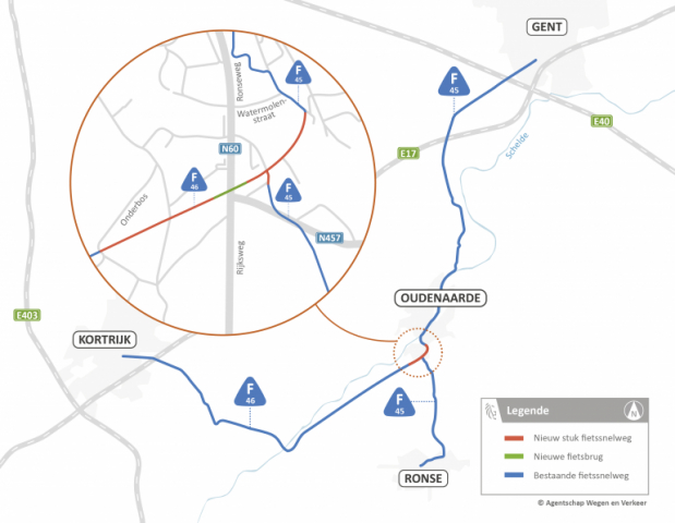 Bouw van een 375m lange nieuwe stalen fietsbrug over de Ronseweg (N60) en de aanleg van 1,4 kilometer nieuwe fietssnelweg die de F45 en de F46 met elkaar verbindt.